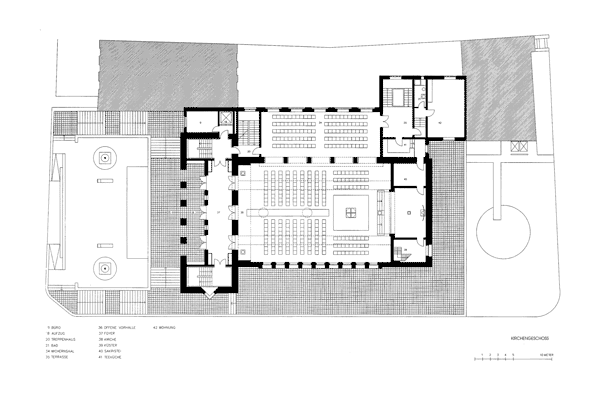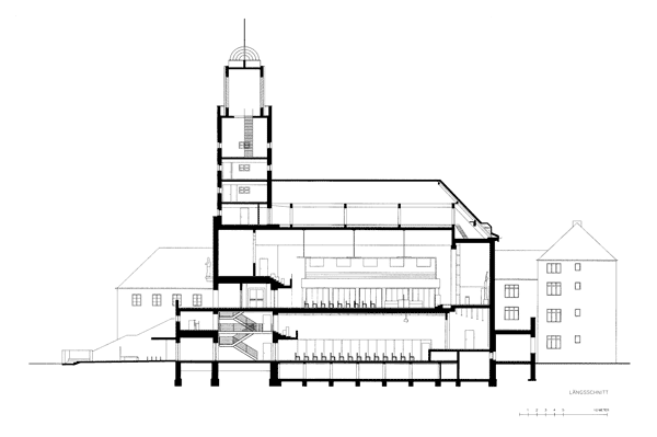 mit der Kirchensaalebene verknüpft ist. Im Zwischengeschoß ist ein